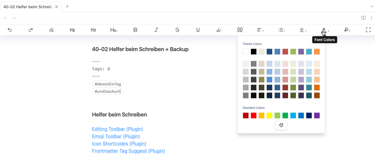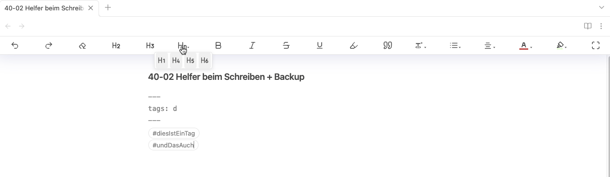 Wenn ihr nun im Frontmatter in einer tags: oder tag: Zeile anfängt zu schreiben, schlägt euch das Plugin Tags vor.