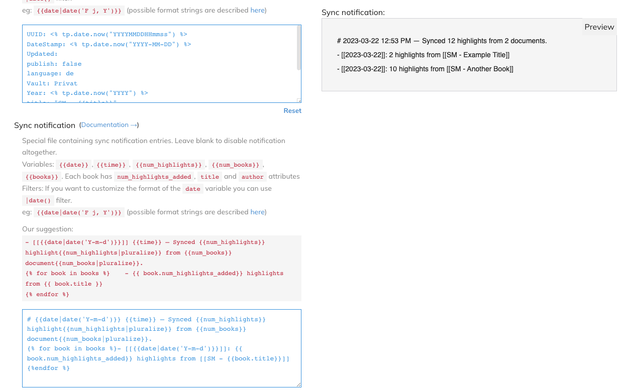 Und zum guten Schluss dann die Sync Notification. Damit wird bei jedem Sync, wenn neue Highlights exportiert werden, am Ende einer Datei (die man in der Plugin-Konfiguration definiert) Informationen hinzugefügt.