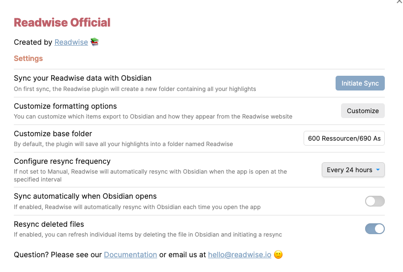Die Konfiguration ist ein wenig gewöhnungsbedürftig, da das meiste außerhalb des Plugins auf der Webseite von Readwise passiert, das ist aber kein Problem.