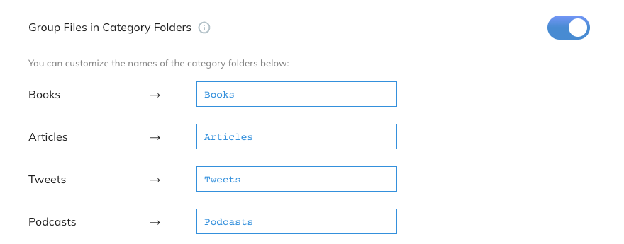 Die Konfiguration fängt an mit der Entscheidung, ob man die Exporte in verschiedenen Ordner basierend auf den Kategorien exportieren will. Sehr schön ist, dass man auf der rechten Seite immer Beispiele sieht, wie das Ergebnis der Formatierung aussieht. (Wenigstens für die Optionen direkt von Readwise.)