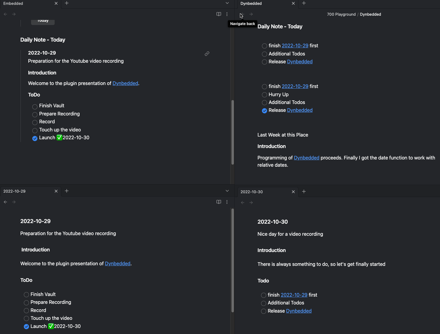 Dynbedded will integrate content from other notes dynamically. This is valid for dataview queries, so it becomes easy to create a library of common queries, but also for date references. You can jump back and forth in time with Dynbedded.