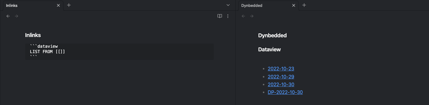 - Dynbedded allows usage of for example dataview queries in several notes. This is quite handy as it means you only need to change the query in one place instead of all over your vault.